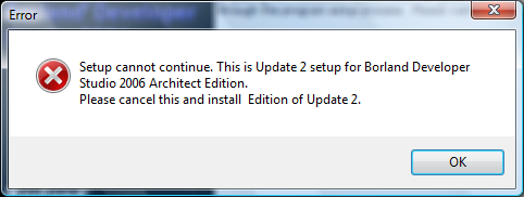 Setup cannot continue. This is Update 2 setup for Borland Developer Studio 2006 <Edition> Edition. Please cancel this and install Edition of Update 2.
