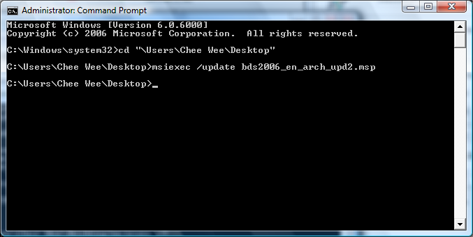 여러분의 BDS 2006의 에디션에 따라 다음의 명령들 중 하나를 실행합니다. 그 전에 BDS 2006 업데이트 2 파일이 위치한 디렉토리로 현재 디렉토리를 이동하십시오.