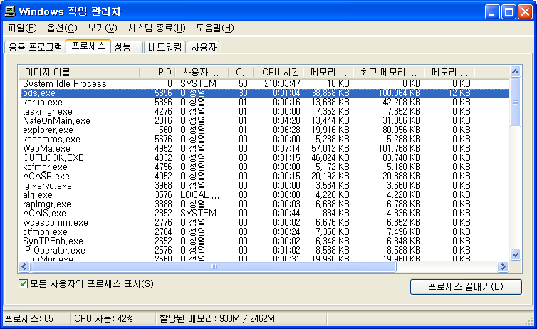 : 프로세스 리스트 보니 bds.exe 프로세스의 CPU의 점유율이