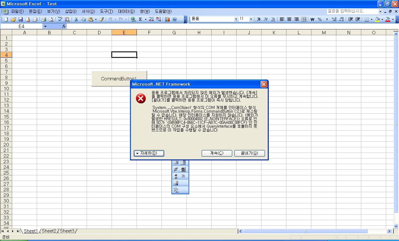 추가 정보: 'System.__ComObject' 형식의 COM 개체를 인터페이스 형식 'Microsoft.Vbe.Interop.Forms.CommandButton'(으)로 캐스팅할 수 없습니다. 해당 인터페이스를 지원하지 않습니다. (예외가 발생한 HRESULT: 0x80004002 (E_NOINTERFACE)) 오류로 인해 IID가 '{04598FC4-866C-11CF-AB7C-00AA00C08FCF}'인 인터페이스의 COM 구성 요소에서 QueryInterface를 호출하지 못했으므로 이 작업을 수행할 수 없습니다.