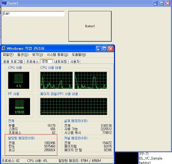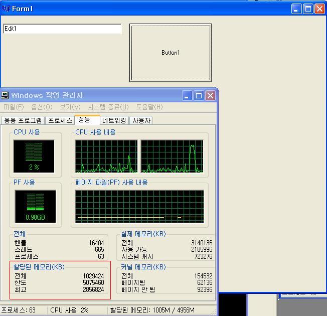 하지만 아래 버튼 1번을 클릭하고 난 후, 메모리가 계속 증가만(첨부 파일 참조) 되고 줄어들지가 않습니다.