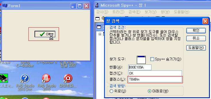 폼에 올려진 버튼을 spy++ 으로 조사하면 TBitBtn이라는 윈도우클래스 이름이 나옵니다.