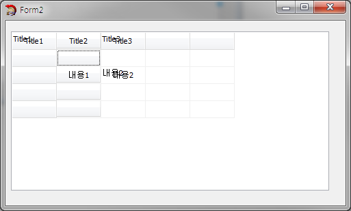 : : StringGrid1->Cells[2][2] = "내용2";