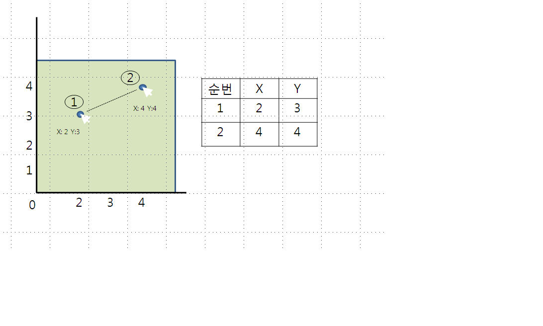 2. 1번의 좌표점이 완성되었으면 2번의 좌표점을 새롭게 찍는데 이때도 좌표점이 GRID에 표기가 됩니다.