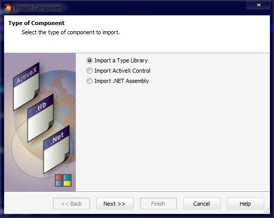 2. Import Component 다이얼로그박스에서 Import a Type Libray 선택 > Next 버튼 선택 (첫번째 그림)