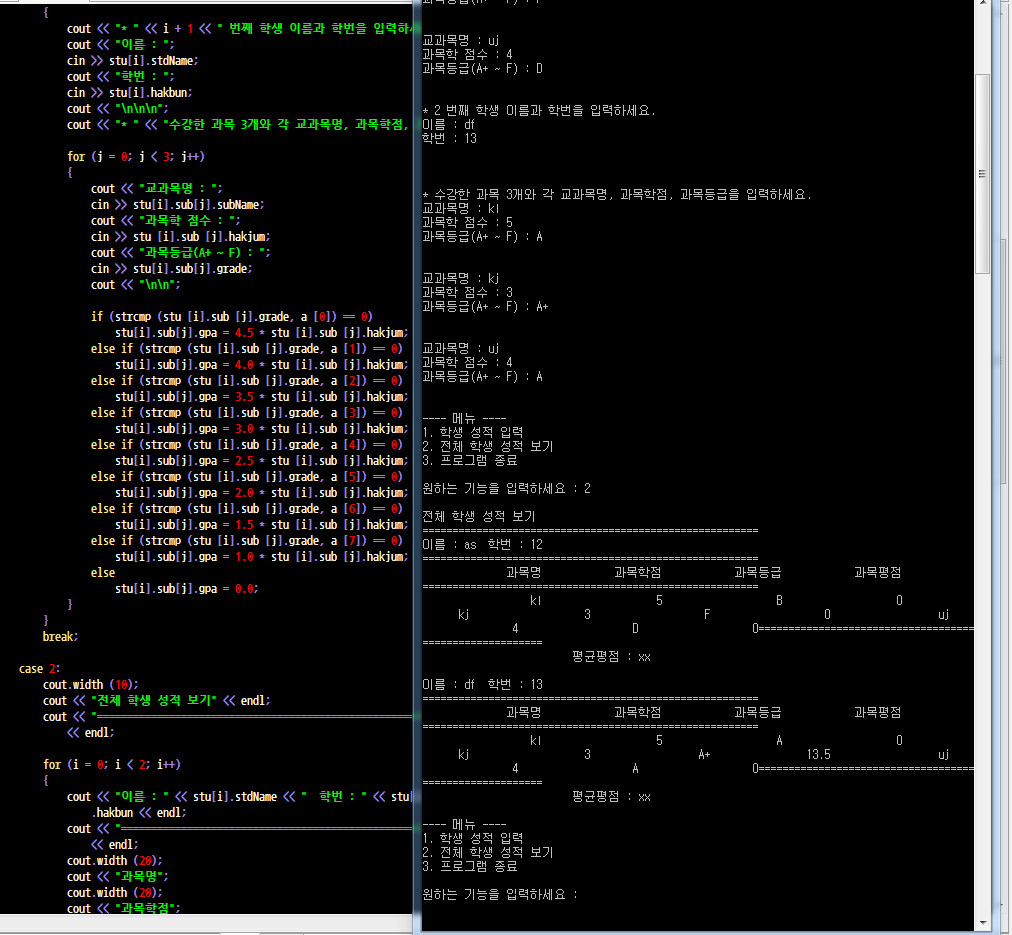 : : cout << "* " << "수강한 과목 3개와 각 교과목명, 과목학점, 과목등급을 입력하세요." << endl;