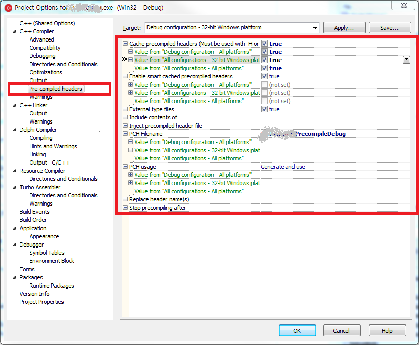 프로젝트 옵션으로 PreCompil를 설정한 화면