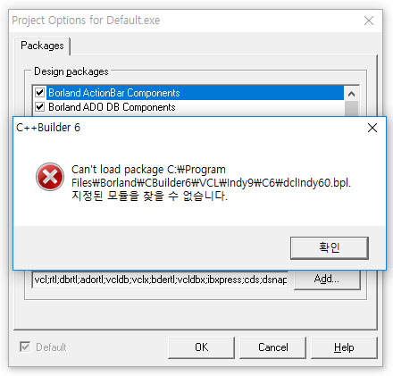 빌더에서 Component->Install Package에서 Add하고 dclindy6.bpl를 열면 에러가 나네요.