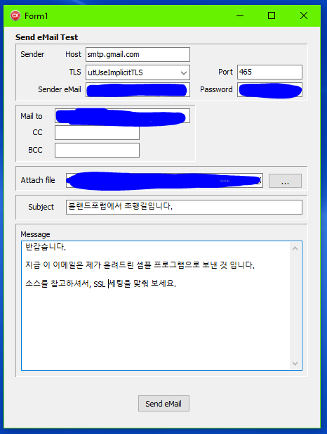 : : IdSMTP1, IdSSLIOHandlerSocketOpenSSL1, IdMessage1 콤포넌트들을 폼 에 올려 놓으시고