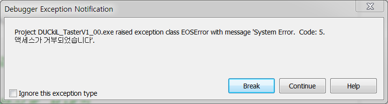 Project xxx.exe raised exception class EOSError with message 'System Error. Code: 5. 엑세스가 거부되었습니다.'
