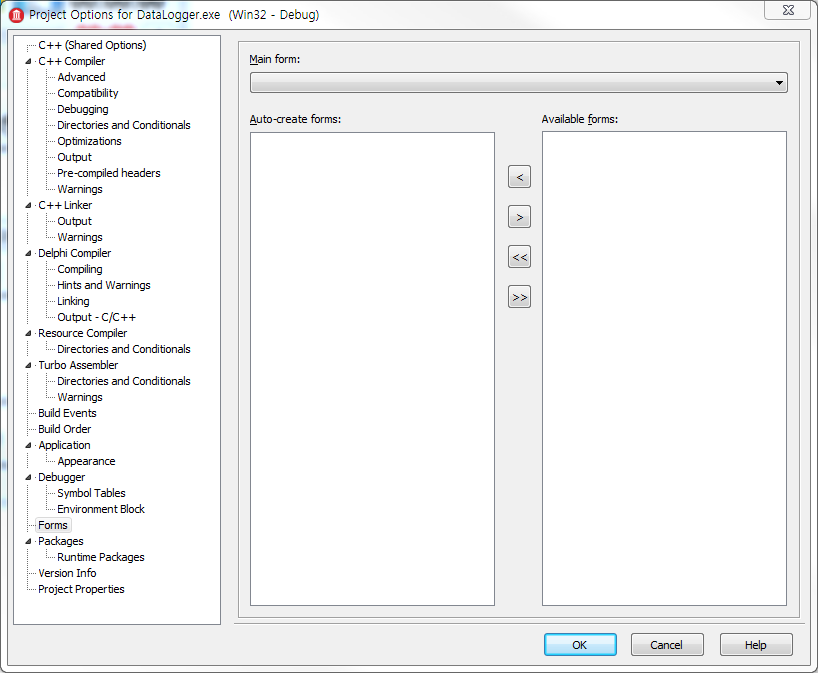 프로젝트 옵션에 들어가서 보면 Form 리스트 정보가 나오지 않습니다.