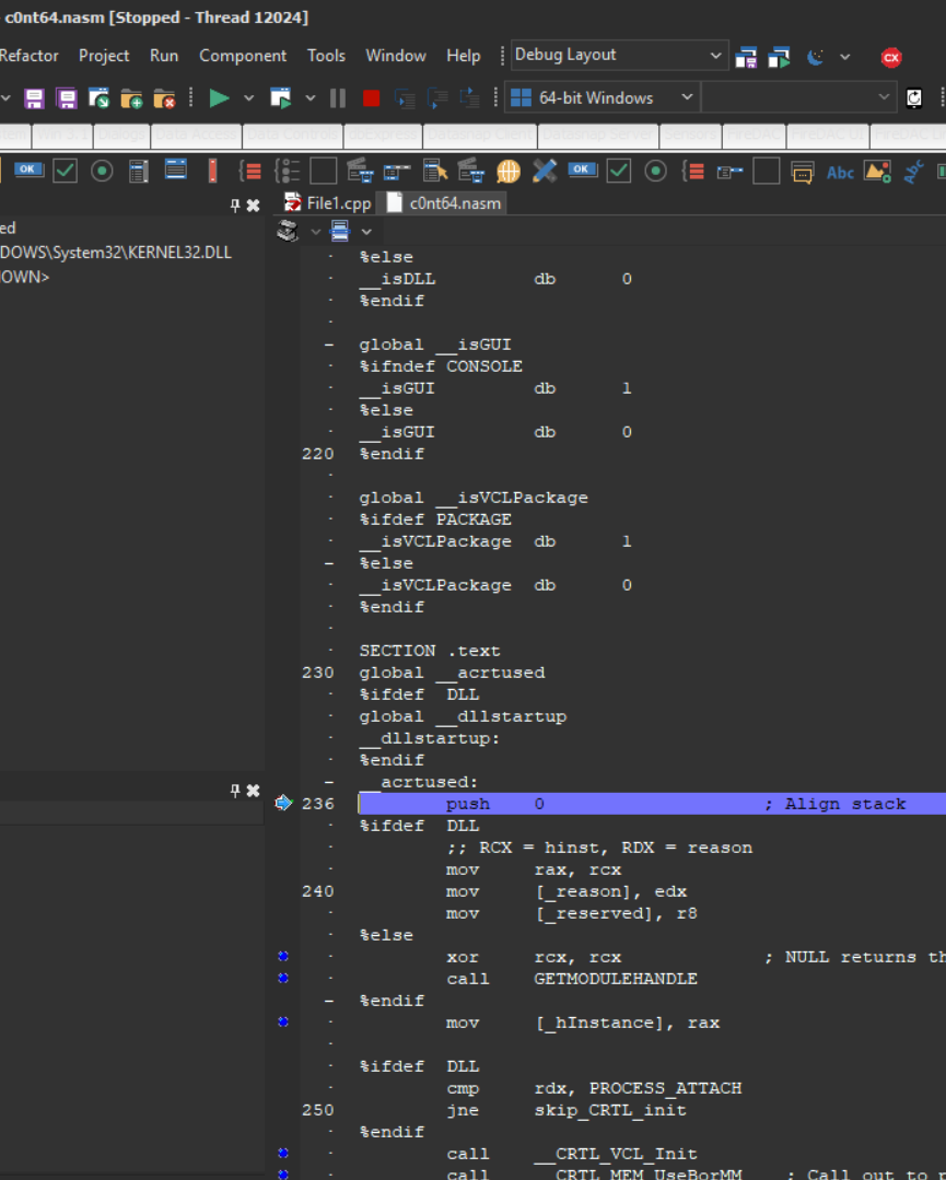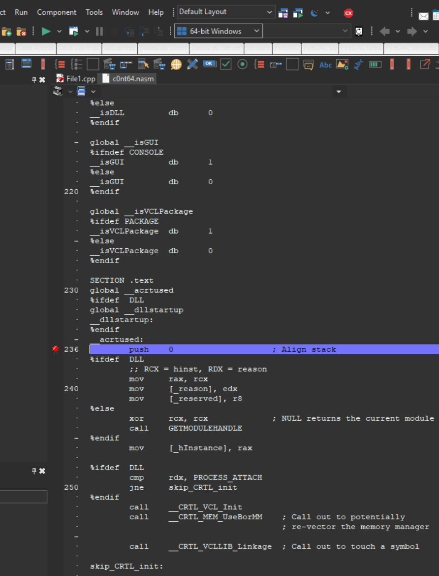 아래와 같이 c0nt64.nasm 소스파일을 IDE에 끌어 놓고, 라인넘버 236번 줄에 브레이크 포인트를 건다.