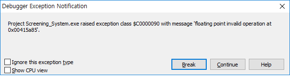 그런데 막상 프로그램을 실행하니 "floating point invalid operation at 0x00415a85" 에러가 뜨면서 실행이 전혀 안됩니다.