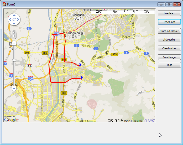 화면에서 TrackPath를 클릭하면 Map이 로드되고, 입력된 GPS 데이터에 따라 이동경로를 그립니다.