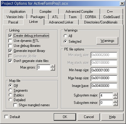 new -> ActiveX -> Active Form 으로 생성하면 옵션창이 보입니다.