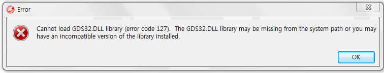 에러는 gds32.dll을 로드하지 못하고 경로가 잘못되고, 버전이 틀리다는 둥..