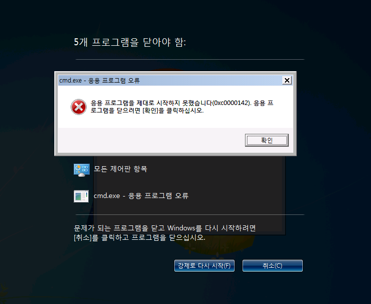 : : Windows가 종료될때 CMD.exe가 실행이 되지 않고 "응용프로그램을 초기화하지 못했습니다.."라는 에러 메세지를 띄우고